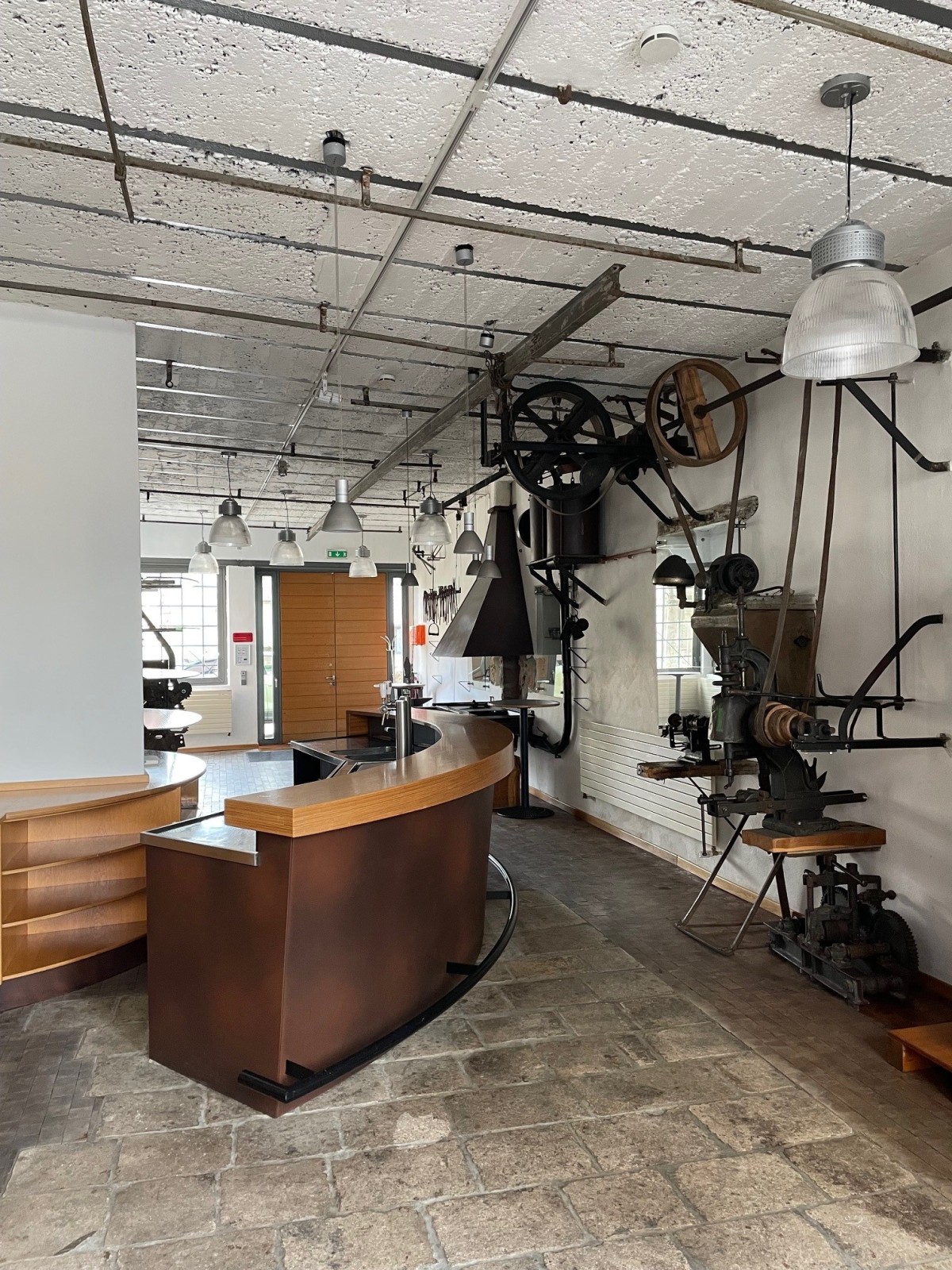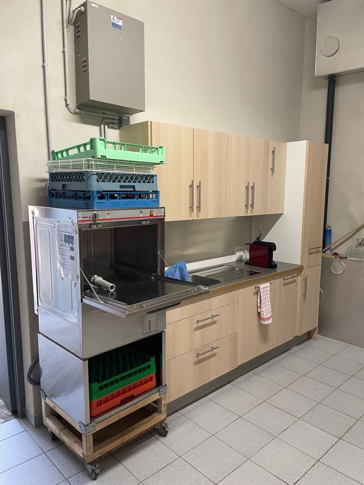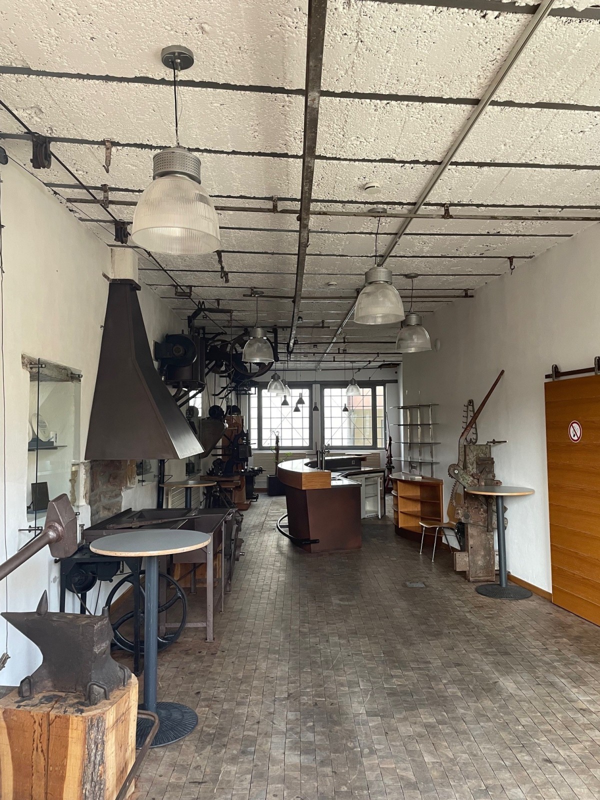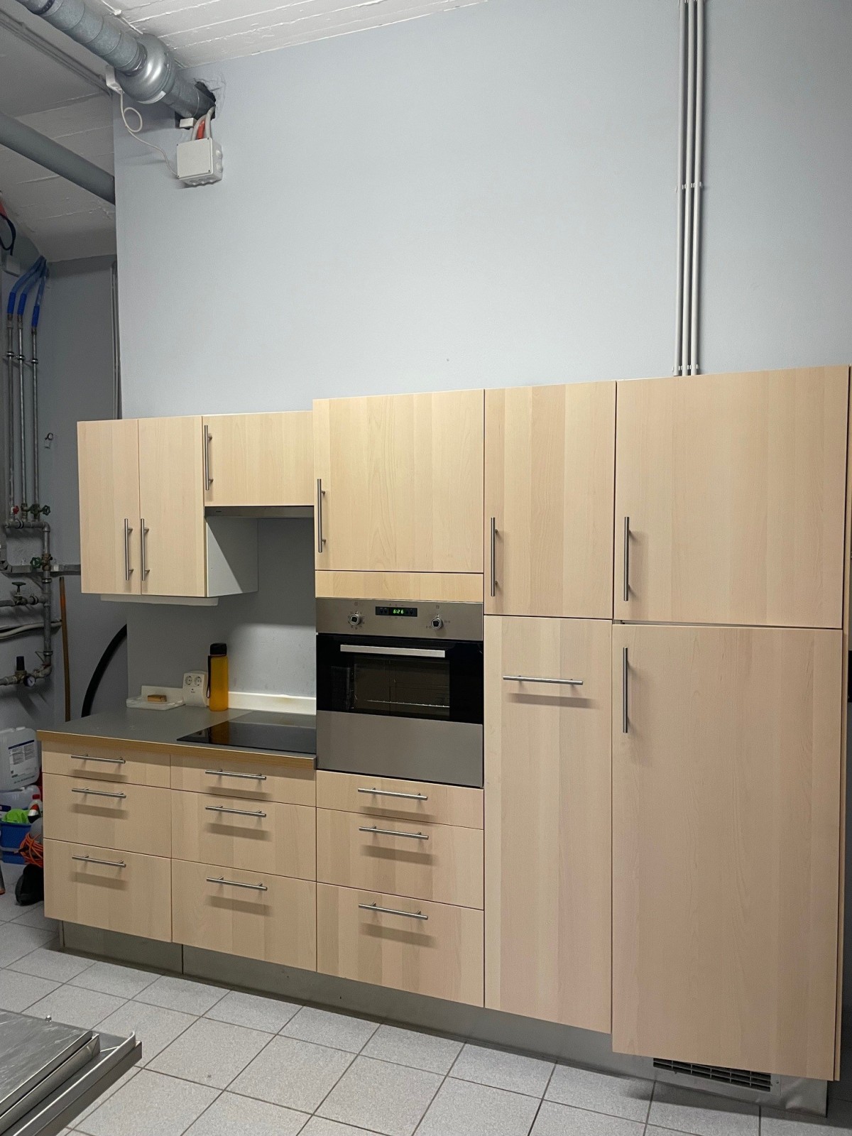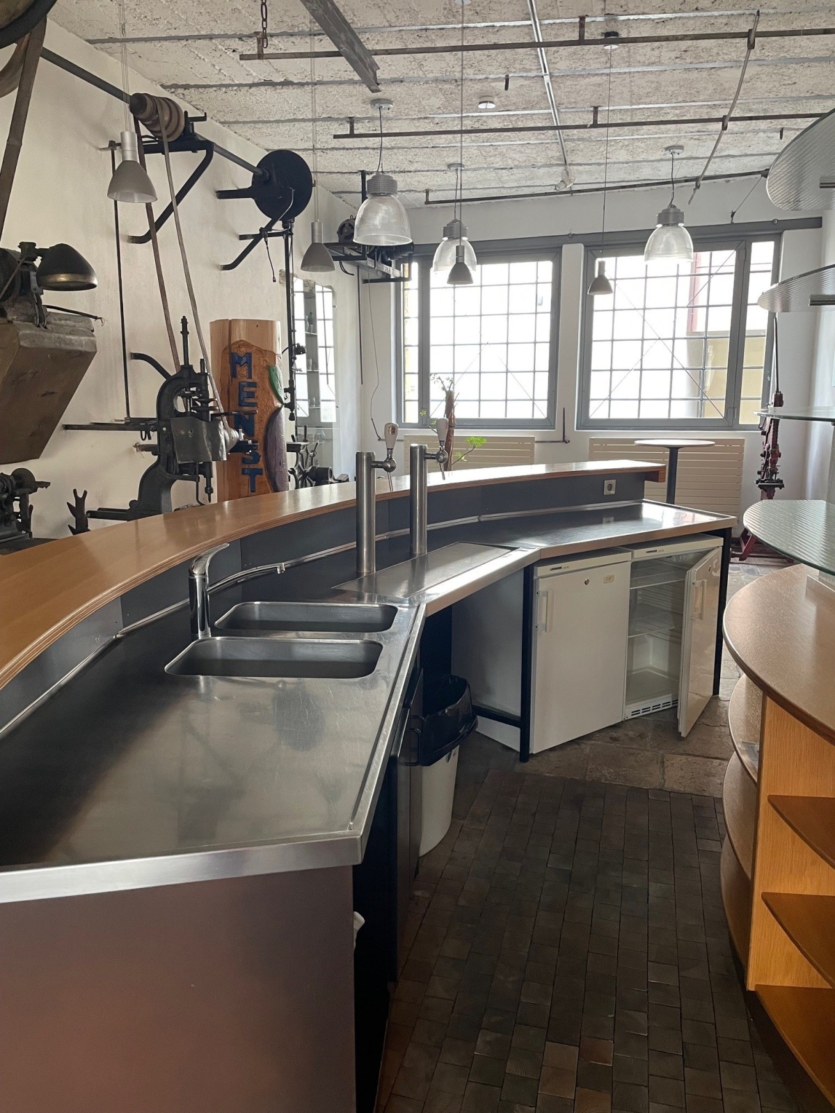 2 réfrigérateurs, pompe à bière, évier, 5 tables hautes